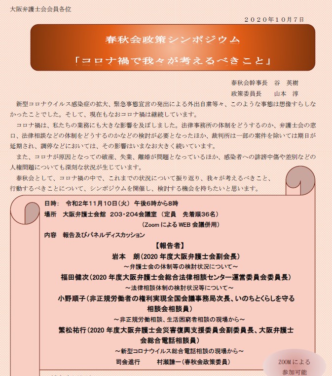 昨今の情勢に照らし、弁護士会館での会議室参加のほか、ZoomによるWeb参加も可能です。是非、ご参加ください。!