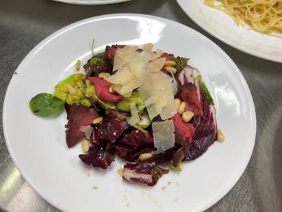 ↑上に載っている白いのは、パルミジャーノレッジャーノ(チーズ)。バルサミコ酢、良い仕事します!紫キャベツのようなのは「トレビス」と言うそうです。松の実もさりげなく。クリスマス料理の一皿にぴったりです。