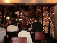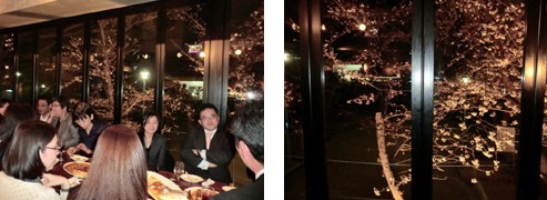 このカフェレストランは、窓から高津公園の桜を眺めることができるという店で、前年度のお花見もこの店で開催されました。場所取りをしなくていい(その代わり、予約を取るのが大変ですが)し、夜でも寒くないし、雨が降っても大丈夫という訳で、今年も必死で予約を取って開催しました。